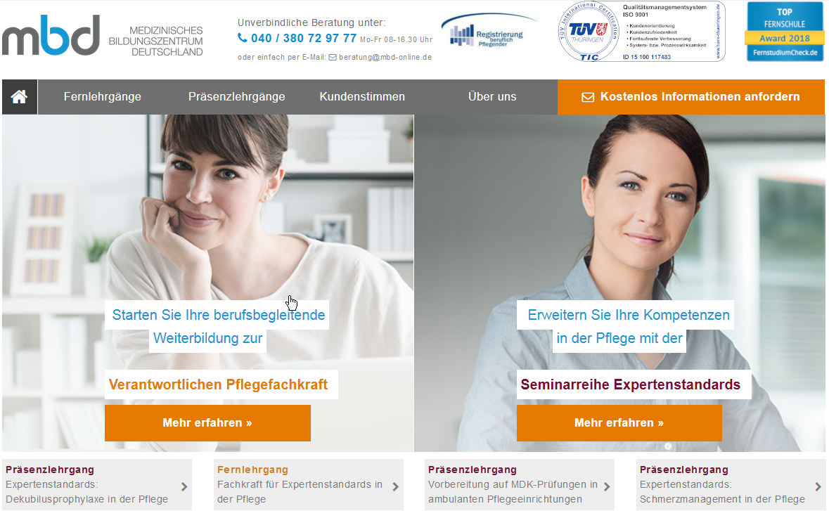 Beschreibung: Fortbildungskurse für Pflegeberufe. Mit Anmeldung / Anfrageformular. Grafische Gestaltung und Konzeption stammen von der Agentur Peak Ace AG